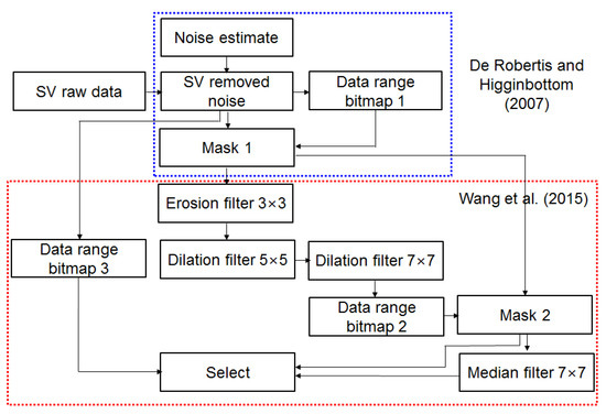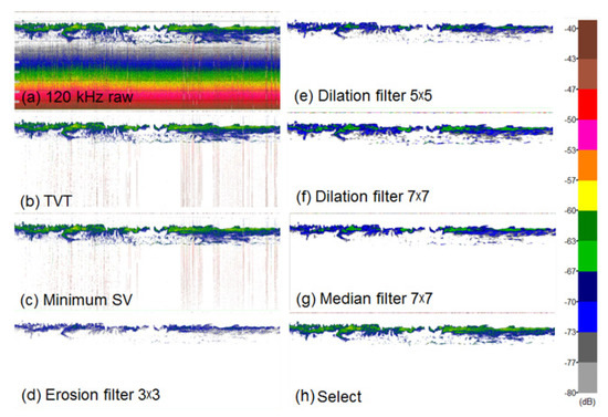 The collected acoustic data were analyzed using acoustic analysis software (Echoview V 8.0, Echoview Software, Australia). Noise from the ship and from electric signals was removed using the methods of De Robertis and Higginbottom and Wang et al. [13,14]. Figure 2 and Figure 3 present a flowchart used for noise reduction and an example echogram following processing. The survey area in this study had a depth of over 1000 m, and background noise increased at greater depths. The time varied threshold (TVT) method was used to remove this noise. This approach involves artificially creating background noise, and then removing it from the raw data. Any remaining noise was removed by using a data range bitmap to eliminate noise smaller than the minimum volume backscattering strength (SV) of Antarctic krill and larger than the maximum SV of Antarctic krill, and then masking it [13]. In the data range bitmap, Antarctic krill were used as the true value, and all other values were used as false values. Although the implemented method was sufficient to remove most of the noise, an erosion filter 3 × 3 function was also used to remove any remaining noise. The 3 × 3 function is the cell range, wherein the filter converts each cell to the minimum value of the surrounding cells within this range; since the surrounding noise of the cells was −999 dB, this caused all noise to disappear. Although this process removes all the noise, the echo signal is weakened, and empty spaces within the original data lead to the loss of the echo shape. A dilation filter function was used to restore lost signal, by converting each cell to the maximum of its surrounding cells to fill in empty spaces in the echo. Cell ranges of 5 × 5 and 7 × 7 were used in sequence to fill in the empty spaces in the echogram. After applying the dilation filter 7 × 7 function, a data range bitmap function was used to generate a mask for the echogram, which was set to the SV range of Antarctic krill. Finally, a median 7 × 7 function was applied, which converts each cell to the median of its surrounding cells, before generating a data range bitmap from the noise-corrected SV echogram and the echo previously selected using the mask and median 7 × 7 function, and using a select operator to obtain the Antarctic krill signal with the noise clean removed [14].