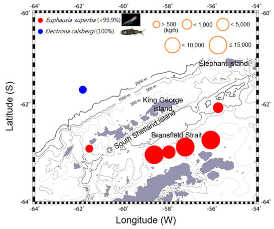 - Kang, D.H.; Hwang, D.J.; Kim, S.A. Biomass and distribution of Antartic Krill, Euphausia superba, in the Northern part of the South Shetland Island, Antarctic Ocean. Kor. J. Fish. Aquat. Sci. 1999, 32, 737–747, (in Korean with English abstract). [Google Scholar]