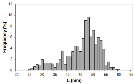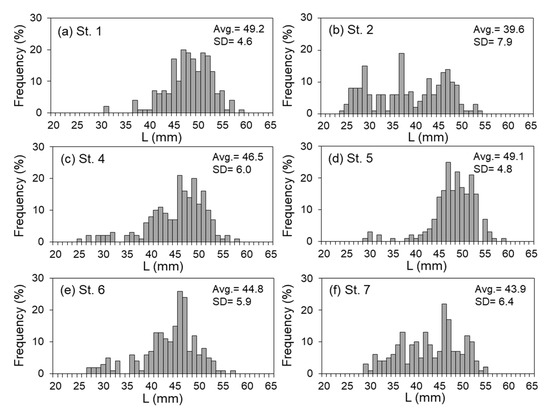 The size (L, mm) of the caught Antarctic krill at each sampling point was: 32.0–60.0 mm (Avg. ± SD = 49.2 ± 4.6 mm) at St. 1, 25.0–55.0 mm (39.6 ± 7.9 mm) at St. 2, 26.0–59.0 mm (46.5 ± 6.0 mm) at St. 4, 30.0–60.0 mm (49.1 ± 4.8 mm) at St. 5, 28.0–58.0 mm (44.8 ± 5.9 mm) at St. 6, and 30.0–56.0 mm (43.9 ± 6.4 mm) at St. 7. Hence, more small individuals were caught at St. 2 compared to the other sampling points (Figure 6). A cross all sampling points, the Antarctic krill were 25.0–60.0 mm (Avg. ± SD = 45.5 ± 6.9 mm) in size, and the distribution was unimodal with the mode at 48 mm (Figure 7).