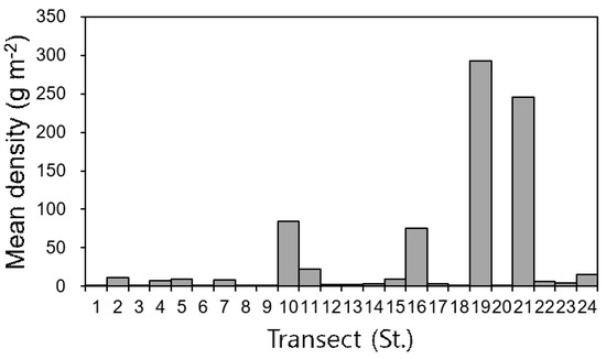 The weighted density of Antarctic krill, along each survey line, was 0.1–109 g m−2, with St. 19 and 21 in the South area containing particularly high densities of over 100 g m−2. Kang et al. [27] previously showed that the density of Antarctic krill in the West and South areas was 44.9 g m−2 and 30.3 g m−2, respectively, while that near Elephant Island was 11.3 g m−2. Reiss et al. [28] reported that the abundance of Antarctic krill was highest near Elephant Island and lowest in the south area. The mean density across the whole South Shetland Island area has been reported to be 37.7–58.3 g m−2 [7,27].
