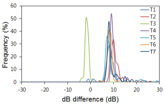 In general, Antarctic krill are distinguished from other organisms using techniques based on dB differences [17,18]. In the present study, we used the SV differences (0.4–13.4 dB) to isolate the Antarctic krill signal. Figure 10 shows the dB differences for each of the collected species from the different sampling points. Antarctic krill was dominant, constituting at least 99.9% of the catch, at all sampling points, except St. T3, where only E. carlsbergi was caught. The inter-frequency SV differences (mean ± S.D.) were 6.8 ± 2.6 dB at St. T1, 10.8 ± 3.1 dB at St. T2, −2.1 ± 0.7 dB at St. T3, 9.1 ± 1.4 dB at St. T4, 8.6 ± 4.6 dB at St. T5, 7.8 ± 1.1 dB at St. T6, and 8.5 ± 2.4 dB at St. T7 (Figure 10). Thus, the SV difference was not the same in waters where over 99.9% Antarctic krill was caught and waters where only E. carlsbergi was caught. In waters where Antarctic krill was caught, the inter-frequency SV difference range (5–95%) was 6.5–11.1 dB, which is included in the dB differences used in this study.