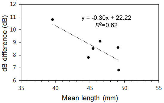The differences in the SV difference ranges were strongly correlated with Antarctic krill size. The inter-frequency SV difference varies with seasonal changes in Antarctic krill size, with the SV difference tending to decrease as Antarctic krill size increases [19]. Likewise, in the present study we verified that the inter-frequency SV difference decreased with increasing mean Antarctic krill size at each sampling point (Figure 11). Antarctic krill TS was calculated using a SDWBA model, with the TS difference (120–38 kHz) at 2–16 dB decreasing with increasing size [20].