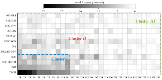 The Spectral Clustering (SC) algorithm can divide the weighted undirected graph nodes. The results should be two or more optimal sub-graphs so that the internals of sub-graphs are as similar as possible, and the distance between sub-graphs is as far as possible to achieve the purpose of clustering. The SC Algorithm has two main steps as follows: The first step is to map the data in the high-dimensional space to the low-dimensional space. The second step is to use other clustering algorithms (such as Min Cut, Ratio Cut and so on) to obtain n clusters in the low-dimensional space. We used “usage frequency of a policy tool in a policy field” as a node, and arranged the samples in DBI according to usage frequency to a matrix. Observing the basic characteristics of the matrix, it can be seen that the node size varies greatly. Thus, we used Ratio Cut to cluster the matrix by considering minimizing the edge weights between different clusters and maximizing the node number in each cluster. Based on the node strengths, the SC algorithm divides the 360 nodes into 3 clusters (Figure 3). Cluster I has 44 nodes whose overall word frequency accounts for nearly 50% of the total frequency. The technology policy (TECH), industrial policy (IND), social security policy (SOC SECUR), and education policy (EDU) clusters have obvious preferences for 11 types of policy tools, including tax and interest subsidy, government service, and financial instruments. Among them, the technology-policy cluster has the strongest preferences for four policy tools, including encouragement and support, government’s purchases of services, laws and management regulations, and financing subsidy. These four tools account for 43% of the total frequency of technology policy tools. Cluster II contains 76 nodes whose word frequency accounts for nearly 26% of the total frequency. The “environmental policy-financing subsidy” and “education policy-market cultivation” are the two nodes with the highest word frequency. Cluster III contains 228 nodes and has almost the same word frequency ratio as Cluster II. The highest frequency is 10, which is the “education policy-authority adjustment” node. There are 121 nodes with a frequency of 0, accounting for 53% of the total number of nodes in Cluster III.