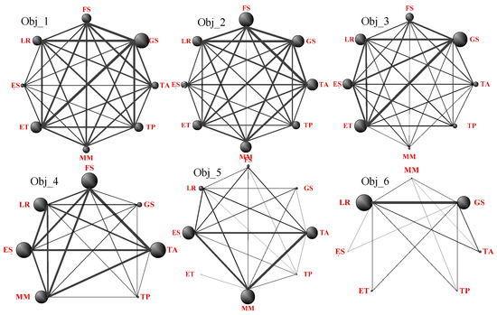 Figure 4 explains the co-occurrence network. The six objectives are (1) government service, (2) financing subsidy, (3) education and training, (4) financing subsidy, (5) financial instrument, and (6) laws and management regulations. The combinations with the highest link strength are tax and interest subsidy—financing subsidy, financing subsidy—financial instrument, government service—education and training, tax and interest subsidy (financing subsidy and financial instrument), and government services (laws and management regulations). It is consistent with the coefficient weights of the objective function (Equation (2)). The consistency further verifies the rationality of the established objective function [42]. The node sizes of Figure 4 refer to the adoption frequencies of policy instruments. The edge widths correspond to the co-occurrence frequencies of the pairs of the policy instruments. FS refers to financing subsidy; GS refers to government service; TA refers to tax and interest subsidy; TP refers to target planning; MM refers to financial instruments; ES refers to encouragement and support; LR refers to laws, standards, and management regulations; ET refers to education and training.