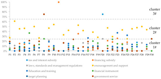 The intervals of Clusters 1, 2, and 3 are 0 to 25%, 25% to 65%, and 65% to 100%, respectively. Most nodes (83.75%) are in Cluster 1. Cluster 2 is mainly composed of the encouraging and supporting nodes, indicating their effectiveness. Specifically, the standard deviation of financing subsidy (0.183) is the largest among the eight policy tools using variance analysis. On the contrary, the standard deviation of target planning (0.055) is the smallest. The cluster ranges are the constraint functions (Equation (4)).