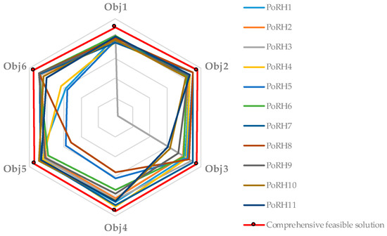 The contribution of this research lies in the establishment of a quantitative MOO model for the rental housing market. The MOEA/PT algorithm enhances the effectiveness of the existing MOO methods by iterative Pareto evolution. For example, we collected 11 representative policy documents of the Chinese rental housing markets. They were issued by the central government (five items) and pilot cities (six items). There were two items from Chengdu, one item from Hangzhou, one item from Shenzhen, one item from Jinan, and one item from Changchun. We used the content analysis method to mine the 11 policy documents and obtained the proportions of different policy tools in one policy as the decision variables of the MOO function. Then, we used the established optimization functions in Section 3 to get the 11 sets of objective function results (Figure 9). The red nodes represent the comprehensive solution set of feasible solutions discussed in this section. The other colored nodes represent the contributions of 11 representative policies to the six objectives. Figure 9 shows that the contribution of the comprehensive feasible solutions to the six objectives is greater than the issued 11 policies. It indicates that the policy tool combination optimization function and MOO algorithm proposed in this paper are effective.