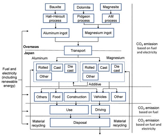 This study prepares several future scenarios in which renewable energy provides the electricity required to manufacture aluminum and magnesium. To that end, CO2 emissions from the mining of bauxite, dolomite, and magnesite to manufacture ingots and alloys of aluminum and magnesium are all included in the LCA. All these processes are performed outside Japan.