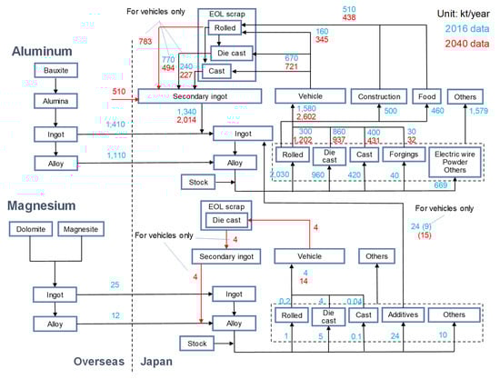 18]. This is because the production of wrought aluminum requires a low level of impurity, and therefore, scrapped wrought products are largely downcycled into cast aluminum products. In an effort to realize the multi-materialization of vehicles, usage of rolled aluminum products is expected to increase. Furthermore, if the demand increases, closed-loop recycling from old rolled products into new rolled products may be achieved. For magnesium, more than half of the magnesium used in Japan is included as an additive to aluminum; thus, if the demand for aluminum increases, the demand for magnesium will increase as well. In Japan, recycling of automobile EOL scrap for magnesium has not begun [