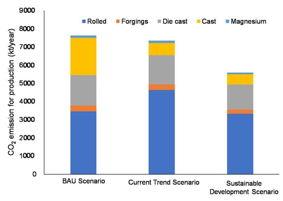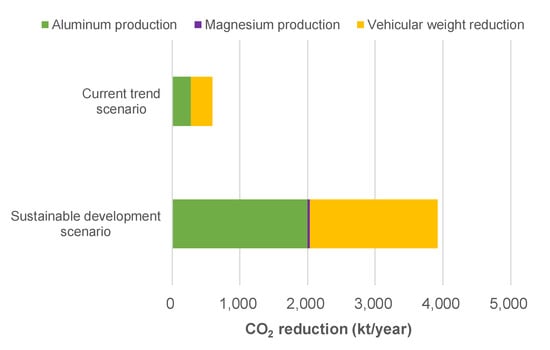2 emissions from aluminum and magnesium production for vehicles in the current trend scenario are predicted to be 281 kt/year less than the BAU scenario, while the sustainable development scenario is predicted to be 2034 kt/year less. Based on the scenarios described in