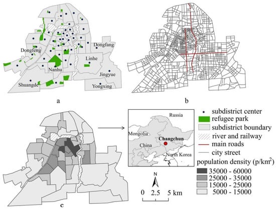 The central urban area of Changchun, China and the spatial data used in the study: (a) spatial distribution of refugee parks, (b) road network, and (c) sub-districts of the central urban area.