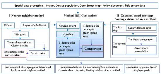 We used multi spatial data, including remote sensing, road network vector, census population, and governmental reports. These data were compiled and inputted into the two models: Nearest neighbor method and Gaussian-based two-step floating catchment area method. The two models delineated service extent for each refugee park, and calculated the average green land area per capita. We then verified the results from the nearest neighbor method against the field data and compared the delineated service extents and the average green area per capita from two models. By doing so, we addressed the three specific objectives identified in the study (Figure 2).