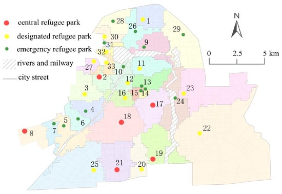 Parks can serve for different disaster prevention functions, depending on the size of their green space, structure, and supporting facilities. Small parks can be used as emergency refugee parks, medium ones can be used as designated disaster prevention parks, and the large ones can be used as central refugee parks. Existing studies place special emphasis on the disaster prevention functions of urban parks and argue that all parks with an area of at least 1 hm2 should be transformed into refugee parks [32]. According to the published studies [33], refugee parks are classified as: (1) Central refugee parks representing city-level or district-level parks with an area of at least 50 hm2, service radius of approximately 5 km, and the greatest accommodation capacity; (2) designated refugee parks with an area of at least 10 hm2, located within 1 h walking time, and a service radius of 2–3 km; they can be used as shelters for district residents during a disaster and as living places for refugees within a certain period after a disaster; (3) emergency refugee parks with an area of at least 1 hm2 and a service radius of 300–500 m; they can be used as emergency shelters within the first 3 min after the occurrence of a disaster. According to the refuge practices in China and abroad, the effective refuge area of central and designated refugee parks should be more than 2 m2 per capita, whereas the emergency refugee park should have at least 1 m2 per capita [34]. Flat space in an emergency refugee park should occupy at least 60% of its total area, while flat space in a designated or central refugee park should be at least 70% of its total area. Accordingly, researchers can determine the effective refuge area for each refugee park and calculate its population accommodation capacity [35].