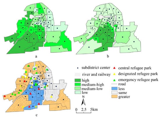 We subtracted the per capita green space area determined by the two methods. There are 12 sub-districts with a medium-high grade of per capita green space area determined by the Gaussian-based two-step floating catchment area method with an average area of 3.74 km2. In these sub-districts, the per capita green space area is high or medium-high, the refugee parks are predominantly the central refugee parks, and relatively high population and road network densities are present. There are 17 sub-districts with a medium-low grade of per capita green space area determined by the Gaussian-based two-step floating catchment area method with an average area of 7.24 km2. In these sub-districts, the per capita green space area is low or medium-low, the refugee parks are typified as designated and emergency parks, and there are relatively low population and road network densities. Sub-districts with a consistent per capita green space area determined by both methods are mostly located in the peripheral areas of eastern Changchun. As such, their per capita green space area is low (Figure 4c). This is overall consistent with the above-mentioned results.