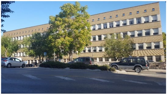 The Diagnosis and Treatment Centre of the University Hospital of Jaén is a health center of the Andalusian Health Service, which belongs to the Health Department of the Andalusian Government, located in Jaén, corresponding to climate zone C4, according to the Technical Code of the Building (CTE) and which meets the typology of a grand tertiary (GT) building [64]. The construction of the building dates from 1972, as a specialized care center. The building’s main activity is the care of the external consultations of the University Hospital of Jaén. Complimentary activities in the building are the medical inspection offices (U.M.V.I.), community mental health, and files in the basement of the building (see Figure 1).