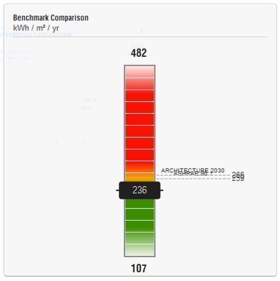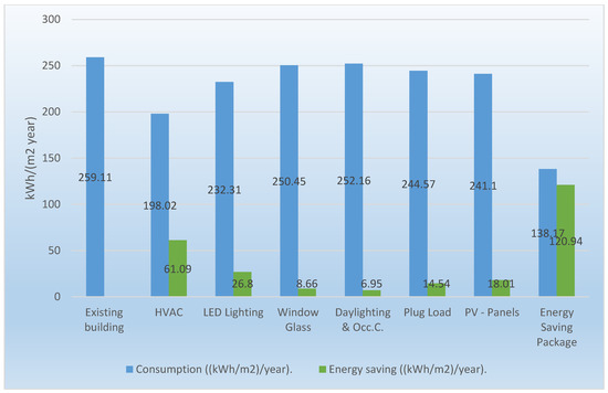 It should be noted that the Treatment and Diagnostic Center, being an old building, does not have its own energy meters but shares the meters of energy supplies with the rest of the buildings that are part of the University Hospital of Jaén. It is, therefore, difficult to verify the consumption calculated in the energy simulation with the real consumption of the building. However, the energy consumption of all the buildings of the University Hospital of Jaén, in 2019, was 380 kWh/m2, the result obtained in the 259 kWh/m2 energy simulation would be admissible, taking into account that the analyzed building has a 12-h operating time since it does not house hospitalization, emergency department or intensive care unit that require 24-h operating hours and are housed in other buildings. Considering the above, it would be pertinent for future work to install meters or measuring equipment that would allow the actual consumption of the building to be obtained and verify the calculation performed by the simulation software.