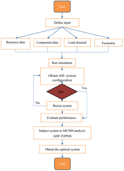 Figure 4 shows the flow chart of the computational procedures. Information regarding the load, solar radiation, wind, power generated capacity and the market price of various hybrid systems are required. All input parameters are fed into the HOMER software to obtain the optimal systems; the alternatives. Then, the outcomes of the system configuration and other criteria are fed into the MCDM to obtain the best configuration for each geo-political zone.