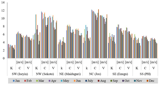 A wind turbine generates electricity when wind flows across the turbine blades at a minimum wind speed, the cut-in speed. Mechanical work is first produced as the turbine blade turns and, thereafter, electricity is generated due to the shaft connected to the alternator. The wind speed data were obtained from the Nigeria Meteorological Agency (NiMET) at a hub height of 10 m for airport like locations and complimented with satellite data from NREL database, which has been proved sufficient for locations in Nigeria [48]. Figure 6 shows the extrapolated monthly averaged wind-speed and Weibull factors across the geo-political zones in Nigeria at hub height 30 m. From the figure, wind speed, (m/s), and scale parameter, , across the geopolitical zones in the country are maximum in the North-central zone (11.035 m/s and 12.266 m/s, respectively) in December and minimum in the South-South zone (3.741 m/s and 4.304 m/s, respectively) still in December, while the shape parameter is maximum in the North-West zone (11.001) in May and minimum in South-West (2.238) zone in November. The annual mean wind speed potential is observed to be highest in NC, followed by NW, SE, NE, SW and SS, in that order.
