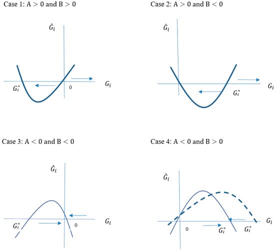 Case 3 is the opposite of Case 1 in that the advantages to the lagging country are stronger than the weaknesses (i.e., A < 0), and the social capacity of the lagging country is higher than that of the frontier country (B < 0). That is, the effect of technological diffusion from the frontier country is sufficient, and the lagging country has a lower interest rate, higher secondary enrollment ratio and higher effect of income inequality than that of the frontier country. In this case, the lagging country can catch up with the frontier country regardless of the initial growth gap.