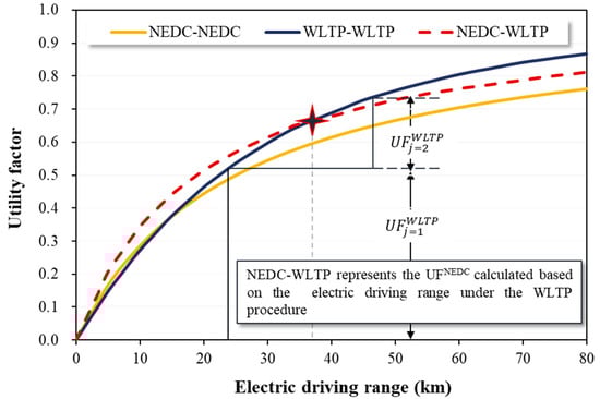 It can be seen from Figure 2 that the utility factor calculated based on NEDC-NEDC and WLTP-WLTP is approximately equal in the range of short driving range. However, the energy consumption of CD mode under the WLTP procedure is calculated by weighting the utility factor of each phase of cycles, so it is more consistent with the travel behaviors. Also, considering that the actual electric range under the two test procedures is not the same, to better evaluate the difference between the two utility factors, the equivalent utility factor of NEDC is calculated by using AER under the WLTP procedure (making the electric range in NEDC transferred to the electric range in WLTP), which is the NEDC-WLTP utility factor curve as shown in Figure 2. It can be found that the equivalent utility factor of the NEDC procedure is higher than that of WLTP when the AER is short. Therefore, this will reduce the proportion of FC of PHEV in CS mode when calculating FC. It results in the FC in CS mode measured by WLTP being relatively high compared to NEDC, derived from Formula (4). Meanwhile, the utility factor of WLTP is higher than the equivalent utility factor of NEDC when the AER of PHEV under WLTP is greater than 38 km (intersection point in Figure 2). Therefore, when calculating the weight FC, the FC of PHEV with a high driving range under the WLTP procedure will below. On the contrary, with the continuous increase of the AER, the utility factor of WLTP is significantly higher than the equivalent utility factor of NEDC. Hence, the weight value of NEDC may be lower than that of WLTP, when calculating the weight FC.