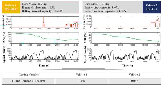As abovementioned, the NEDC procedure only tests one cycle for PHEV in CD mode, the FC will be 0 if the AER of the testing vehicle over 11.03 km. However, the WLTP procedure tests the complete CD phase. The engine of PHEV will start in the condition that the power demand is higher than the power provided by the battery or the SOC of the battery is relatively lower [16]. To understand the test procedure and the determination of energy consumption for PHEVs under WLTP, the testing results of two PHEVs tested in the Joint Research Centre (JRC) of the European Commission Laboratories are cited in this study [16], as shown in Figure 3. The results showed the driving cycles, SOC of battery, and engine revolutions per minute (RPM).