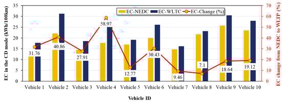 The EC in CD mode under the NEDC procedure is obtained by the meaning of dividing the electricity consumed in a test cycle by the range of an NEDC cycle (11.03 km). The EC in the CD mode under the WLTP procedure is to consider the weight value of each speed phase in the whole CD mode, as shown in Formula (5). Through collecting the EC of PHEVs from the CATRC in China and other research institutions in the world, it is the EC of 10 vehicles in the CD mode under the WLTP and NEDC, as shown in Figure 4.