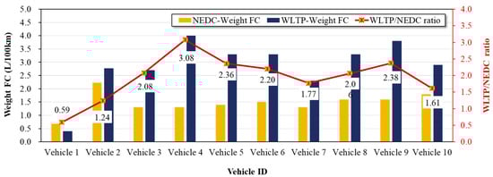 The weight FC of PHEV under the WLTP and NEDC procedure is shown in Figure 6. It can be seen that the weight energy consumption of PHEVs has increased significantly except for vehicle 1. The decrease of weight FC of vehicle 1 shows that the weight FC under the WLTP procedure might be lower than that under the NEDC procedure. It gives the credit to the difference of the calculation method of weight FC between NEDC and WLTP. In other words, the calculation method of WLTP is in favor of the PHEVs with a longer AER. Moreover, this phenomenon will be more significant with the increase in battery capacity. Thus, it can be said that the WLTP procedure is more friendly to the weight FC of PHEV with a larger battery.