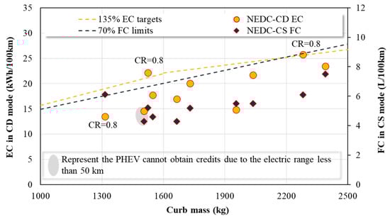 The NEVs credits distribution for 10 PHEVs under the NEDC procedure is as shown in Figure 7. It should be noted that only when the EC in CD mode and the FC in CS mode are lower than the target and limit curves at the same time can one credit multiplier be obtained. It can be seen from the figure that 9 PHEVs can obtain NEVs credits except for vehicle 2 whose AER is less than 50 km. Among them, vehicle 3 and vehicle 9 can only get 0.5 times credit multiplier due to high EC, and the other seven PHEVs can get 1 credit multiplier.