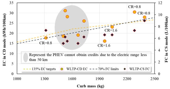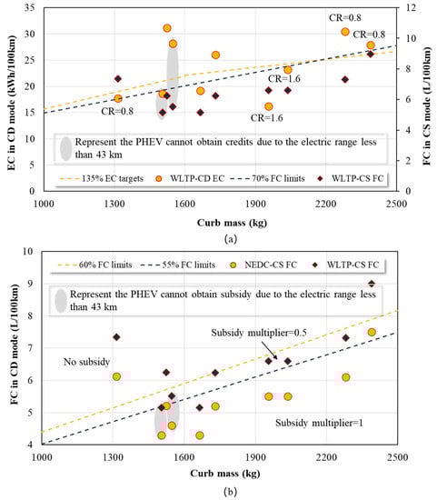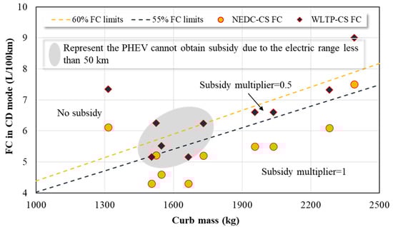 Meanwhile, it can be seen from Figure 10b that six PHEVs can get 0.5 multiplier subsidy under the WLTP procedure after the AER is reduced to 43 km, mainly because the FC in CS mode is too high to meet the technical thresholds of 1 multiplier subsidy. The remaining four PHEVs are not subsidized, of which two are due to the AER less than 43 km, and the other two are due to the FC in CS mode exceeding the threshold value of subsidy, so they are not subsidized. Compared to Figure 9, the decrease of AER technological requirement could improve the accessibility of subsidy while the higher FC in CS mode could lead to the lower multiplier subsidy.