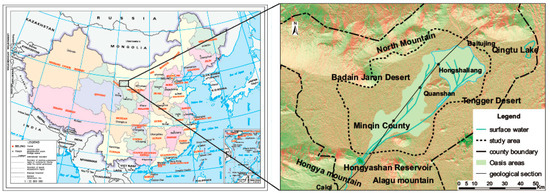 Figure 1). This area is a typical desert oasis in the inland river basins of Northwest China. Minqin Basin is on the north of Hongya Mountain–Alagu Mountain, on the south of North Mountain, on the east of Badain Jaran Desert, and on the west of Tengger Desert (