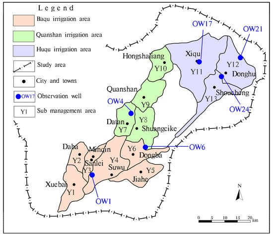 According to the GIS data provided by the water resource bureau, the oasis in the study area was divided into 13 sub management areas (Y1–Y13). The scope of the sub management areas was combined with the borders of the 13 township regions and the borders of 3 sub irrigation areas. The 13 sub management areas belong to the current three irrigation areas of Baqu (including the sub management areas of Y1, Y2, Y3, Y4, Y5, and Y6), Quanshan (including the sub management areas of Y7, Y8, Y9, and Y10), and Huqu (including the sub management areas of Y11, Y12, and Y13). Six long-term observation wells were selected as the groundwater control monitoring wells in the study area (