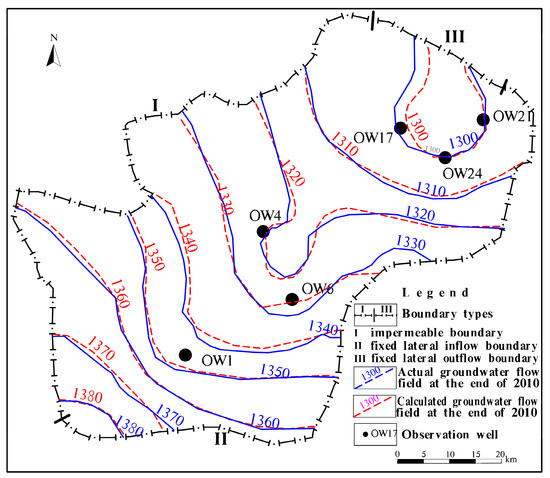 Figure 3) and generally reflected the trend of the groundwater flow. The maximum error was no more than 4 m between the actual water level and the fitted values of the typical observation wells, which demonstrates that this model approximately reflects the dynamic groundwater table characteristics of the study area. The groundwater balance calculated by the model also reflects the actual hydrogeological conditions of the study area. The change trend between computed flow field and actual flow field was in substantial agreement in