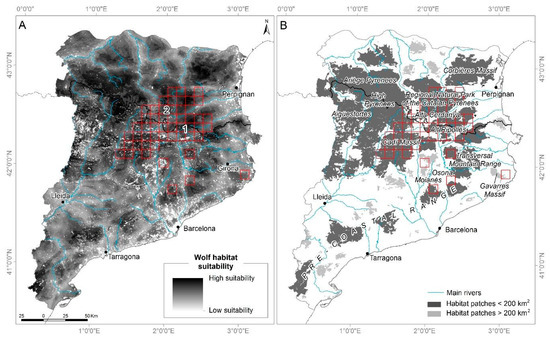 (A) Wolf friction map or degree of suitability for wolf habitat. (B) Optimal areas for wolf habitat classified according to size: only fragments above 200 km2 are suitable for hosting stable packs of wolf populations. The red squares indicate the presence of wolves at some time since 2000. Areas with permanent wolf presence: 1—Alt Ripollès; 2—Alta Cerdanya. The most suitable fragments for wolf settlement (Figure 2B) are distributed along the main mountain ranges of the area of study and occupy almost one-third of the entire area.