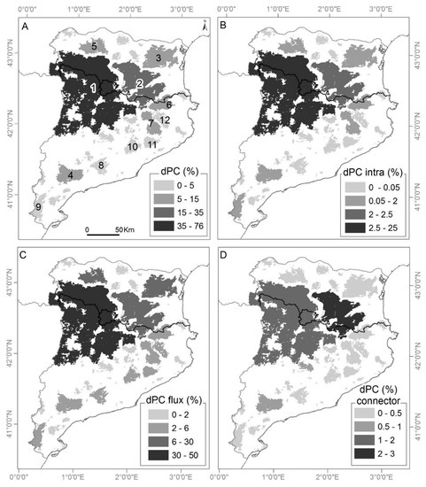 where dPCk is the importance of node k to overall habitat availability in the landscape. PC′ is the PC value after removing k from the analysis. The dPCk [73] can be divided into three fractions according to the different ways each path can contribute to habitat connectivity and availability in the landscape: