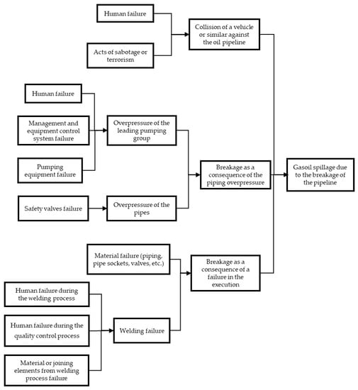 Figure 3 shows an example of the application of the Cause and Effect Analysis Technique, where an event consisting of a gasoil spillage of an oil pipeline during its operation is evaluated. In this case, the gasoil spillage could be caused by three main events: collision of a vehicle or similar against the gasoil pipeline, breakage because of the piping overpressure, and breakage as a consequence of a failure in the execution. These events in turn have causes that generate them until they reach simpler events, such as human failures or material failure (valves, piping, etc.).