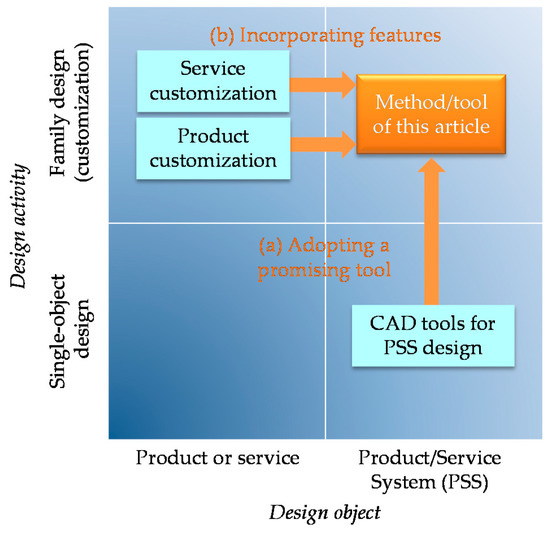 This research builds upon different categories of existing research in terms of the design object and design activity, as depicted in Figure 1, in light of their usefulness and feasibility. The use of an existing CAD tool for PSSs is nominated based on its potential and is adopted for this research (indicated by (a) in Figure 1). Rather than developing the model and tool from scratch, the authors instead took advantage of existing insights as much as possible. Literature related to customization, which covers both product and service customization, was utilized (see (b) in Figure 1).