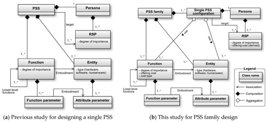 This paper proposes a new meta-model for PSS family design by incorporating PSS family and configuration features into the previous method, as depicted by Figure 3b. In the new meta-model, the relationship between the different objects can be described as follows: The PSS family model holds information about all the possible service and product offerings the provider could offer. A PSS family defines and consists of the functions and entities available in PSSs currently being designed. Information on each PSS is modeled as a single PSS configuration that refers to and uses the available functions and entities in the PSS family. This supports efficient PSS family design. Two more attributes of functions are explicitly added to the model to evaluate the PSS family: offering cost and cost type. The details of these are explained in Section 4.2.