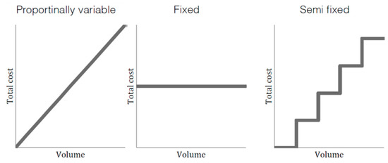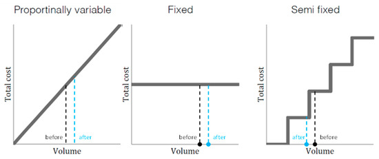 Since a PSS consists of both physical and nonphysical entities, the costs of different functions can vary in several ways. The proposed evaluation is based on different archetypes for cost variations in the early stages of the design. Here, three different types of cost are used, as shown in Figure 4: proportionally variable, fixed, and semi-fixed according to a marginal increase of the entity to the associated function. In other words, simplified means of calculating costs were chosen for this study, even though there are other means with higher preciseness available, such as activity-based costing (ABC), which is also implemented in Service Explorer [59]. The designer assigns cost types to functions and defines how the cost varies when functions are added to single PSS configurations. The total offering cost of function within the entire PSS family is represented as .