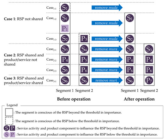 Step 1. Remove muda (waste)—products or services that are implemented for a segment but do not influence any RSP of the segment are removed, as depicted by Case 1 in Figure 5. For instance, in Case1-1, Segment 1 is not sufficiently conscious of the RSP, and therefore Service 1 influencing this RSP is regarded as waste. This removal omits the cost of the products or services and decreases the total cost. The decision is made by the designer considering the importance of the RSP and the function in question. Muda is addressed as the first step because of the higher priority than mura and muri, as mentioned above.