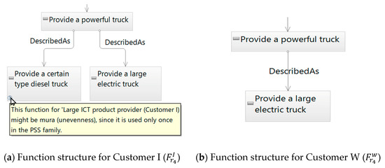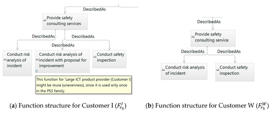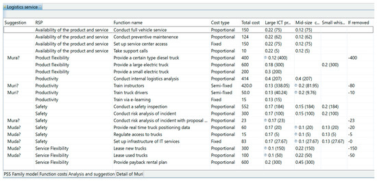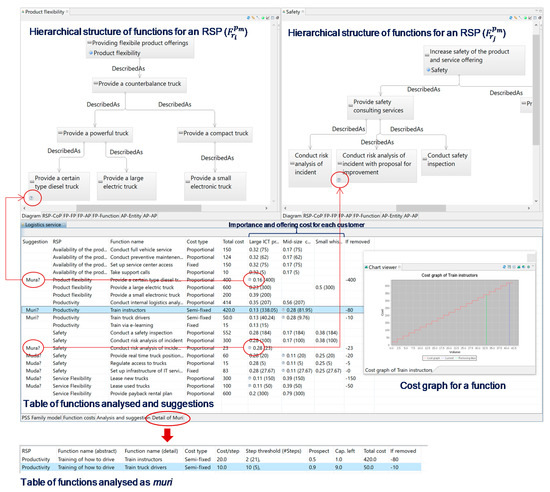 According to the proposed model in Section 4.1, as well as the method in Section 4.2 and Section 4.3, new implementation on Service Explorer was achieved to support PSS family design. Figure 8 is a screenshot of the newly developed Service Explorer. The upper parts of the figure show the hierarchical function structure for each RSP in a single PSS configuration (i.e., ). The developed software visually shows and suggests functions that could be recognized as muda, mura, and muri. These functions are indicated by a question mark in the table (in the importance column) in the lower part of Figure 8. With this interface, designers are supported to make relevant decisions to delete or replace functions recognized as muda, mura, and muri on a given PSS family rather than on a single PSS. Information provided to a designer in relation to muda, mura, and muri is explained in the following sections.