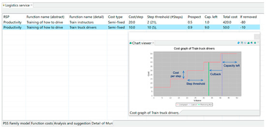 A number of functions and attributes in the PSS family was modelled according to the three personas and the five RSPs described above. The personas, RSPs, and functions were limited in numbers, in order to be easier for a reader to grasp this case. These functions are summarized in Table A1 in Appendix A. Most of the functions are provided to multiple customers, providing high potential of family design. The functions labelled with “(abstract)” directly influence an RSP, such as the provision of a truck or consulting services. The lower functions are those that indirectly affect an RSP through content. A lower function describes or decomposes its parent. The weights of functions are obtained from the significance of RSPs according to the QFD method, as explained in Section 4.2.2. The costs for each RSP are hypothetical and do not represent the actual costs for any product or service. The total offering cost of functions in Table A1 is calculated considering the cost type, times used in the PSS family, and marginal cost.