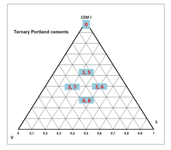 This study focuses on Portland cement clinker (K)—blast-furnace slag (S)—coal fly ash (V)—based ternary cements (K-V-S). The composite cements were prepared by mixing CEM I 42.5 R with these cement constituents (two ground granulated blast-furnace slags and one coal siliceous fly ash) and the different proportions of these studied ternary mixes are illustrated in the ternary diagrams shown in Figure 1. Blast-furnace slag and coal siliceous fly ash content was 25% or 40%, therefore, the CEM I amount was 20%, 35% or 50% (Table 2). CEM I 42.5 R was also used as a reference (100%).