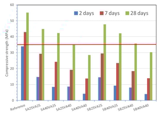 At early ages (2 and 7 days) SA provides similar compressive strengths than SB (Figure 2). However, at later ages, (28 days) this similarity is apparently ended by the faster pozzolanic reaction development in the finer binder [].