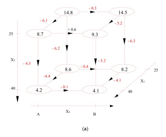 Finally, for three−way interactions, the effect size was calculated by simply subtracting the partial fit from the corresponding average. For instance, the X1X2X3 effect when X1 and X2 levels are high and X3 level is low (X1+X2+X3−) was calculated by using Equation (2):