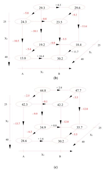 Scheme of the full factorial experimental design: (a) 2-days; (b) 7-days; (c) 28-days. Compressive strength results at the corners (MPa).