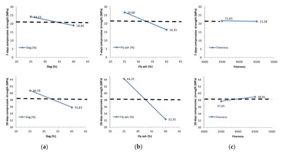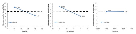 The Grand Mean or the global average of the results is 9.05, 21.51 or 38.30 MPa at two, seven or 28 days, respectively (Table 3). The results average for X1− (i.e., factor X1 run at low level) at two days is 11.55 MPa ((14.80 + 8.70 + 14.50 + 8.20)/4). Table 4 collects all the average of the results calculated for the three responses considered in this paper. All the factors run at a low level, X1−, X2− and X3−, showed higher mean compressive strength than the factors run at a high level, X1+, X2+ and X3+. Nevertheless, the difference between the high and the low-level decreases from 2 to 28 days due to the effect of the pozzolanic reaction development at older ages [].