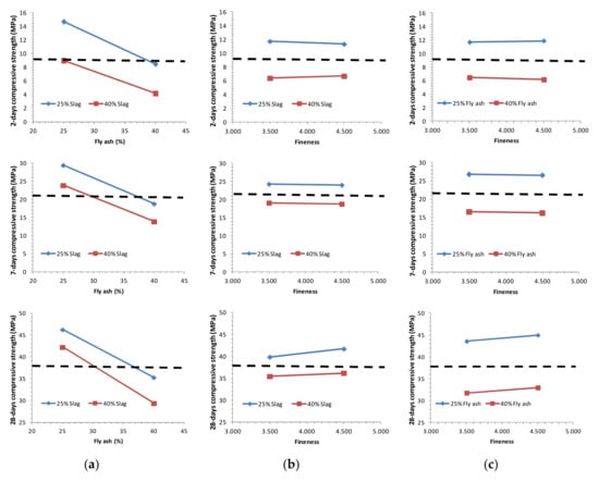 In general, the higher ground granulated blast-furnace slag and coal fly ash amount, the lower compressive strength for all the tested ages. These results are in accord with other ones [,,].