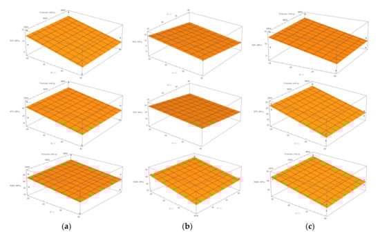 where β0 is the constant term and βi is the linear effect of the input factor xi (slope). Then, the rest of the terms βij are the linear by linear interaction effects corresponding to the factor xi and xj. The result achieved with the empirical model considering the significant parameters for 2, 7 and 28-days compressive strength is shown in Equations (4)–(6), respectively, and Figure 6. Their coefficients of determination, R2, were 0.9960, 0.9996 and 0.9993 for two, seven and 28 days, respectively.