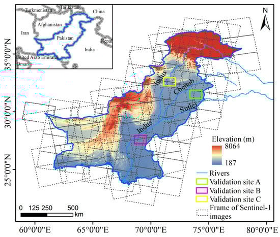 Currently, most SAR-based methods for flood detection are intended to monitor large river floods located in northern temperate latitudes, including eastern Europe [27], Germany [28], Canada [29], and the UK [14]. Few studies have focused on flooding in large-scale semi-arid regions, such as Pakistan, which has diverse landscapes, such as glaciated mountainous terrain, snow/ice, dense drainage network, farmland, desert, etc., and suffers regular severe flooding in the wet season and intense periods of drought for a whole year. The application of already-developed methods for delineating large flood areas in these regions are not effective and feasible.