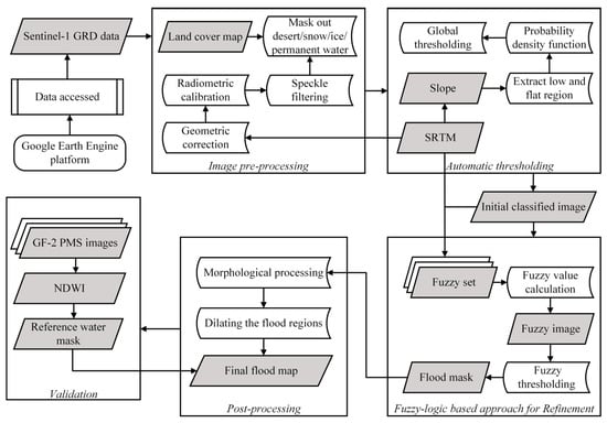 In summary, a flood mapping method must be able to capture floods in near real time, which means that it should operate rapidly with little computational cost instead of tedious training and parameter adjustment process, especially when using multiple images in order to observe the flood evolution patterns. Additionally, the procedure for flood detection must have broader applicability to large, semi-arid regions with complex flood situations and diverse land cover types. Finally, an operational flood detection process should be independent of the reference image and specific satellite sensors. Based on these requirements, this paper presents an approach to automatic and rapid detection of floods in semi-arid regions using multi-temporal Sentinel-1A/1B ground range detected (GRD) images. Unlike the methods that are presented above, the proposed approach has small computation efforts, can detect floods in a consistent and reliable way in images of large size, covering extensive floods and also some small and disperse flood areas. The Sentinel-1 mission is operated by the European Space Agency (ESA), which offers its products free to the scientific community, and has a high repetition rate (six days). Therefore, there is good data availability for flood analysis. As for large-scale applications, the developed flood mapping algorithm is based on a four-step process consisting of image preprocessing, initialization of the classification by global thresholding, fuzzy logic-based classification refinement, and morphological post-processing. A fuzzy logic-based algorithm integrating SAR backscatter information and different auxiliary data into the classification process is used to refine the classification accuracy. The proposed method is used to determine the extent of inundation during seasonal flood events in Pakistan in 2015 using available Sentinel-1 images.