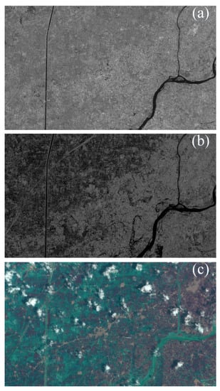 Example showing preprocessed Sentinel-1 Synthetic Aperture Radar (SAR) images taken (a) before the flood and (b) after the flood. The dark portions of the image represent flat water surfaces. (c) Corresponding optical GF-2 PMS images acquired after the flood.